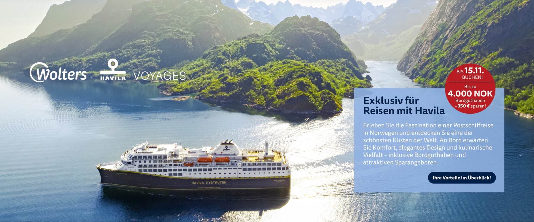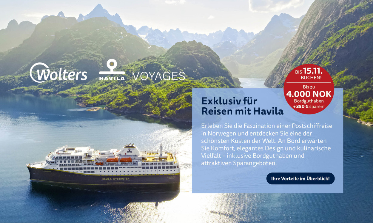 Werbebanner von Wolters: Zwei Personen stehen in einer Felshöhle und blicken auf einen dramatischen Wasserfall bei Sonnenuntergang. Text: Einzigartige Rundreisen in Europa. Jetzt entdecken!